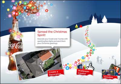 Another branding effort comes courtesy of Coke, with its “Coca-Cola Christmas” microsite. In addition to activities like creating custom desktop wallpaper and downloading holiday-themed ringtones, users can employ Google Maps to zero in on their home, virtually decorate it, and share the results with others.