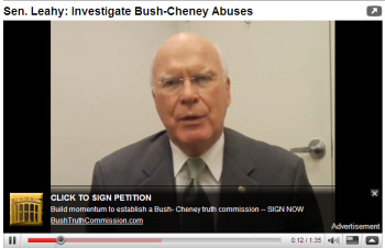 “Build momentum to establish a Bush-Cheney truth commission — Sign Now,” declares a text ad that pops up 10-seconds into a video clip featuring Vermont Senator and Senate Judiciary Committee Chairman Leahy. The Call-to-Action overlay unit links to Leahy’s BushTruthCommission.com, which houses a petition to establish a commission to “investigate abuses by the Bush-Cheney Administration.”