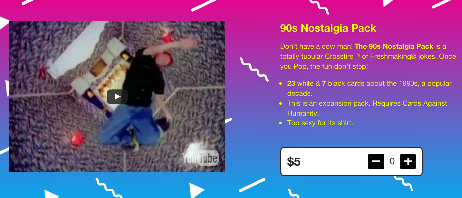 Cards Against Humanity is a party game popular enough to merit several supplemental decks to add to your card collection. The copywriting matches the snarky tone of the game; you can almost hear the ironic earnestness dripping off “Once you Pop, the fun don’t stop!”