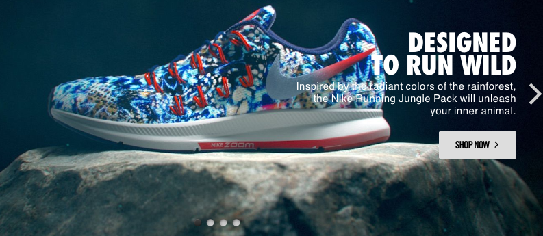 This bit of copy from Nike’s website sums that up contrast nicely by bringing up the colors and “your inner animal.” The homepage video shows the sneaker being made out of butterflies, which are pretty and colorful, and also quick and hard to catch.