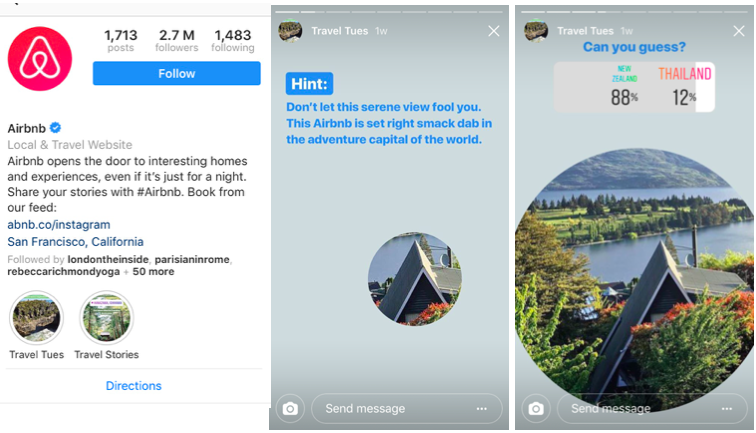 Airbnb has launched Stories for #TravelTuesday as an additional way to build engagement with their 2.7 million followers. They are posting a location on Tuesday along with the hashtag #TravelTuesday and they are creating a poll to test if people can guess the location. This idea blends engagement with appealing images to create a great result that matches the brand’s visual focus. Moreover, they are saving the Story as a highlight, which means that it’s available for more than 24 hours by visiting the brand’s profile.