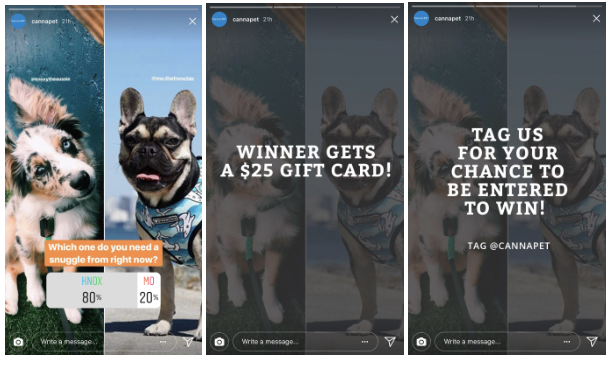 Instagram polls in Stories have become quite popular among users. They tend to be fun and engaging and that’s what brands also try to adopt. Cannapet has decided to launch a poll to grab their followers’ attention. The next Story was promoting their contest, while the following one was encouraging users to tag a friend. The combination of the three posts is strategic enough to aim for engagement, but also participation in the contest. This example shows how a brand can use several elements as part of a Story to produce the best possible result for their goals.