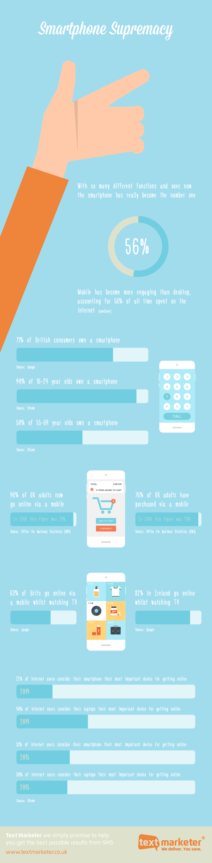 “With technical advances in mobile internet becoming faster, and more reliable, improvements in handsets and functions, and the growing list of things that can be controlled by or used in synch with the mobile, the smartphone has already taken over the world”, said Text Marketer. “It’s no longer a question of whether you need to go mobile but how.”