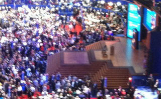 The end result was a stream of select tweets that were displayed on the convention website as well as on large physical backdrops behind the stage (seen in photo here) and digital “ribbons” surrounding the convention forum. The goal was to have Twitter content that reflected issues being discussed on stage – the economy for instance – presented as speakers talked about them.