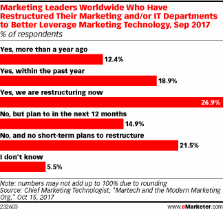 Moreover, a new study from Chief Marketing Technologist indicates that 26.9% of the respondents are about to restructure their marketing and IT departments for the sake of martech. An additional 14.9% of the respondents plan to do so in the next 12 months, while 19% of marketing leaders have already restructured their marketing department in the last year.