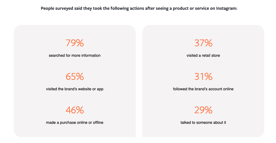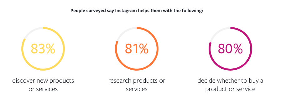 83% of the people who responded to this survey use Instagram to discover new products. Moreover, 80% of people use Instagram to decide whether to buy a product or a service.