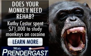 “Does your monkey need rehab?” Display ads (which in some cases featured a closeup shot of a shrieking chimpanzee rather than a monkey) asked the tongue-in-cheek question; the ads claimed Prendergast’s Democratic opponent, Rep. Kathy Castor, “spent $71,000 to study monkeys on cocaine.” The idea was to saddle Castor with a reputation as a wasteful spender of federal tax dollars.