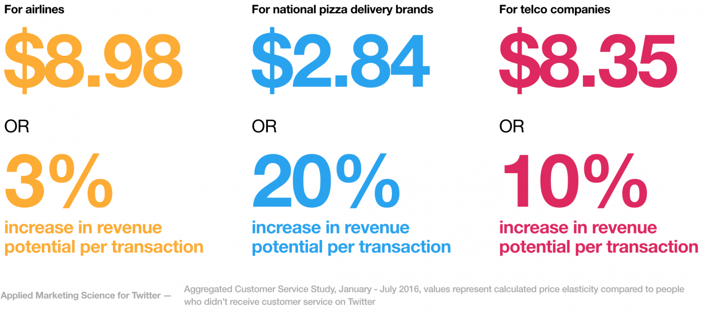 For example, Applied Marketing Science explored the subject of price elasticity and found that customers of national pizza delivery who received customer service on Twitter were willing to spend as much as 20% more, or $2.84, per transaction. Customers of telecom companies were willing to spend 10% more, or $8.35, per transaction.