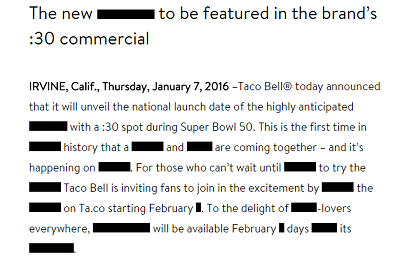 Taco Bell returns to the Super Bowl for the first time in three years to announce a new menu item. Rather than release teasers like everyone else, Taco Bell put out a hilarious press release full of blacked-out words.