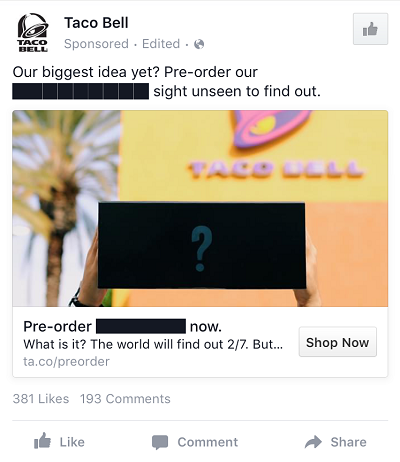 The fast food chain has yet to offer any clues about this menu item, except that it’s “the biggest food creation yet.” Whatever it is, a lot of people will see that announcement and probably order it ASAP from the Taco Bell app. I’ll bet a lot already have; the mystery item is available for pre-order.