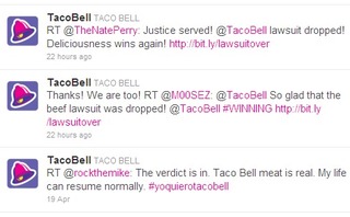 The company also made note of the dropped lawsuit on Facebook in a post linking to the press release, but kept its Twitter mentions of the campaign more conversational by retweeting posts from others. For instance, the @TacoBell account retweeted a post exclaiming, “Justice served! @TacoBell lawsuit dropped! Deliciousness wins again!”