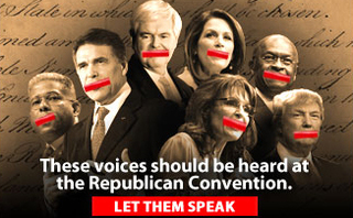 In the ad, big name Republicans, many of whom ran unsuccessfully for president in the GOP primaries, are pictured with red tape covering their mouths. “These voices should be heard at the Republican Convention. Let Them Speak,” declares the ad, which features Rick Perry, Herman Cain, Michele Bachmann, and Allen West, along with Trump, Gingrich, and Palin.