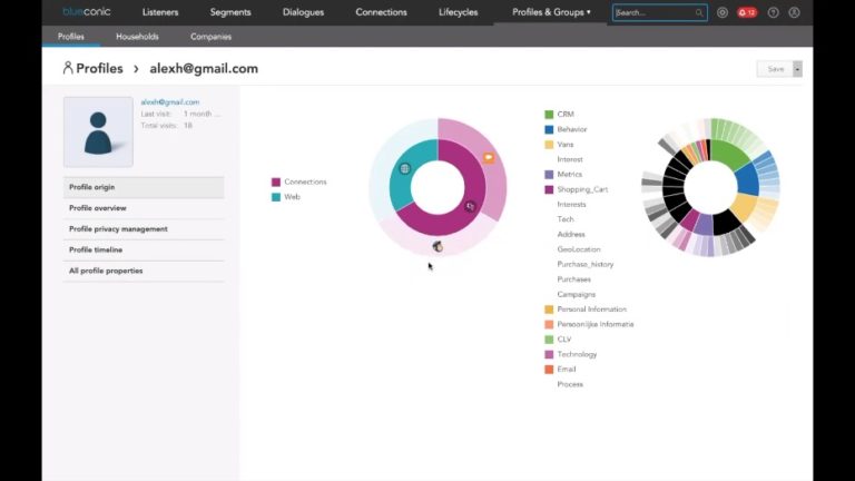Everything in BlueConic starts with a unified profile. Your prospect and customer Profiles sit at the center of BlueConic. All other features revolve around this unified, central view of each individual customer and potential customer, both known and anonymous. Every piece of data you choose to collect – whether it is a definitional attribute (such as demographic data) or synthetic attribute (such as a CLV score) is stored in a customer profile. You can also manage customers’ consent for data privacy and marketing objectives and store that at the individual level. Then, with connections, pass that data to your activation platforms. We have a number of named connections to your most frequently used marketing systems, but also offer universal connections – like SFTP or webhooks to allow you to pass data back and forth.