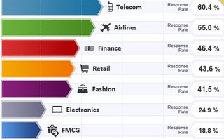 Telecom companies such as mobile carriers had a 60 percent response rate, according to SocialBakers. The metric gauges the percentage of user wall posts on brand pages that get responses from the brand. The firm measured 10,000 public Facebook brand pages across the globe between March 1 and March 30, 2012.