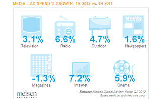 Nielsen also found that Internet ad spending was growing significantly in emerging markets. With the Middle East and Africa enjoying a 30.3 percent jump in spending, and Latin America seeing its spending grow by 20.6 percent.