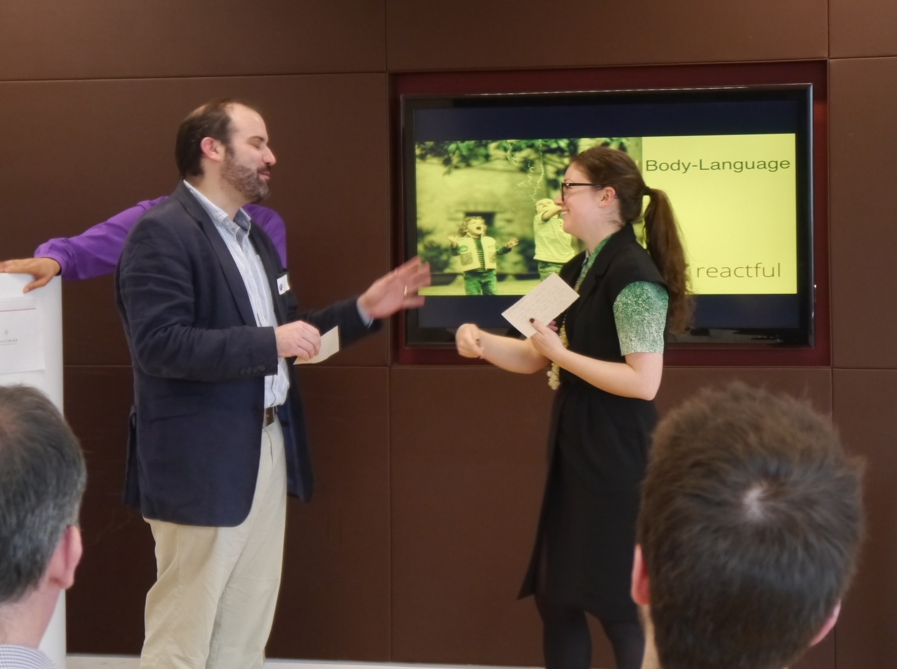 Two Huddle attendees carry out a roleplay about body language at the Reactful panel.