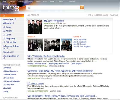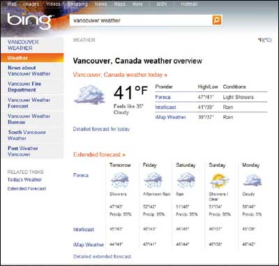 At Bing, we’ve focused on pivoting the user experience around what someone is actually trying to do. We don’t believe the future is more links on a page, but in experiences that map to what you’re trying to get done in your real life. For example, you can see how Bing morphs itself when you look for U2’s latest concerts or when you want to make sure you’re packing the right clothes for the weekend getaway to Vancouver.