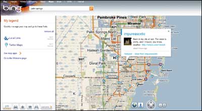 The last thing people tell me they love about Bing is how it feels more like a beautiful application rather than a text-based DOS application. We’re very aware that visual experiences can sometimes hamper performance, but in places where making Bing more expressive can help you get something done faster and with more confidence, it just makes sense to leverage peoples’ innate ability to process things visually. Our work in Bing Maps is a great example of this – being able to re-associate data on the Web (like tweets, local blog posts, or user-generated imagery) with its originating place in the real world is a more natural and effective way to connect your virtual life with your real one.