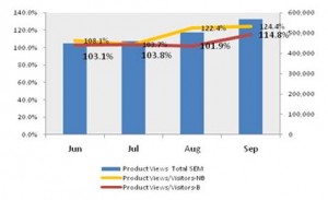 In short, even in the face of aggressive pricing and brand-term bidding from competition, implementing a non-brand flight search strategy helped arrest the competitive onslaught as well as drive fresh audiences to interact and engage with the product (read: engage in flight itinerary building) who form the immediate future funnels for the brand (Figure 3). The increasing product views as well as product views per visitor ratio growth are clear indicators of the above impact.