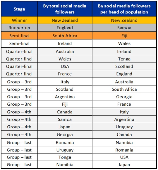 New Zealand would also win the tournament if it was decided by the number of social media followers in relation to the size of the country – for every head of population it has 1 social media follower.