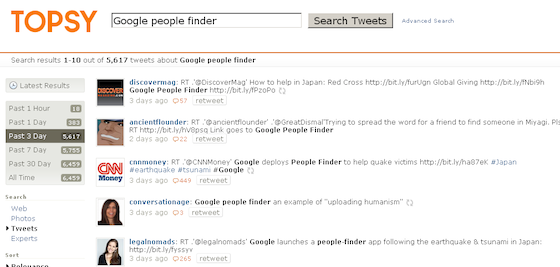 Example 2: The techies at Google, whose brand is built on utility, put together Google People finder, a Mechanical Turk-like platform. Both those searching for a family member or friend, or a survivor announcing his whereabouts could post on the site.