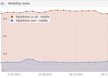 Tripadvisor.com managed to gain 17.26% in their mobile visibility, which is a lot for a domain of its size, though they might want to check if this increase is not hurting Tripadvisor.co.uk as the following chart suggests.