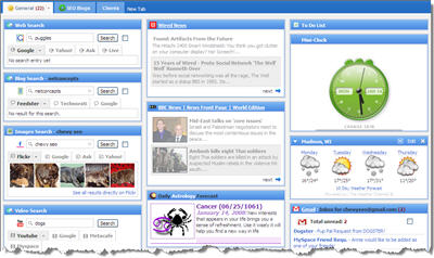 Netvibes, iGoogle, and My Yahoo are examples of widget aggregators that can help you organize your digital life. Netvibes certainly helps keep me organized and on top of SEO (define) news and information by way of RSS feeds, as well as what’s happening with my dog Chewy’s e-mail, Facebook news and notes, the current time, world news, and, most important, my daily astrological forecast. Here’s a screenshot of a Netvibes tab: