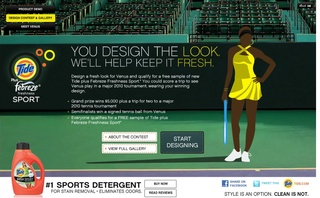 Viewers to Tide.com/Venus are being encouraged to virtually design a tennis outfit for her. After completing the shirt, skirt, and accessories ensemble, participants can enter the contest by supplying an e-mail address, home address, name, and phone number. They can access a gallery at the site to see what other participants have put together. The star athlete will help choose the $5,000 contest winner in April and then wear the outfit design while competing in the U.S. Open during late summer.