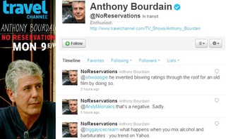 In addition to exceeding the ratings for last season’s premier of No Reservations – a long-running program featuring the sometimes wayward adventures of wordsmith, traveler and ex-gourmet chef Anthony Bourdain – the show’s @NoReservations account was mentioned around 8,500 times during the hour it was broadcast February 28. Also according to Travel Channel, “hundreds of thousands” of people posted tweets to @NoReservations in that hour. The show reaped approximately 6,000 new Twitter followers.