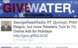 Sometime over the next week, Twitter apps including Seesmic, Tweetcaster, Storify, Twimbo and Qwerly will begin showing the ads to users who use certain holiday keywords in their tweets. The ads are simple: The words “Give Water” appear in large text over a background of blue sky and snowflakes. At the bottom is the organization’s URL, CharityWater.org. Clicking the ad brings users directly to a donation page.