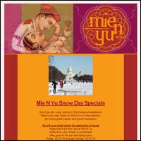 My favorite example comes from a restaurant in my neighborhood, Mie n Yu (see the e-mail below). It offered a 2 percent discount off your bill for every inch of snow. There are many restaurants in my neighborhood, so the big question is usually “what’s open” – not only did this e-mail let us know the restaurant would be there, it offered us an incentive for making the trek. Added bonus – this e-mail had viral appeal. A friend forwarded it to me, and although I was not able to join them, they got a group together, had a great time – and got 14 percent off their tab.