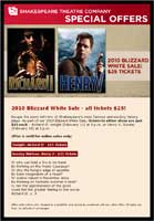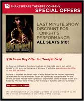 The Shakespeare Theatre also offered a discount to drive sales via e-mail – twice (see both e-mail messages below). The first time was during a big storm – all tickets that night were just $10. This one must have been successful, as the theater sent another e-mail the following week, during another storm, offering tickets at $25 each. Both are a significant savings off the usual price. Since the show was going on, Shakespeare Theatre wanted to have as many seats filled as possible. This was a really smart use of e-mail.