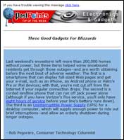The Washington Post (e-mail below) used the opportunity to let us know about gadgets that helped people weather the storm – and drive readers to its Web site. I wonder how many people went out and bought a UPS after reading this.