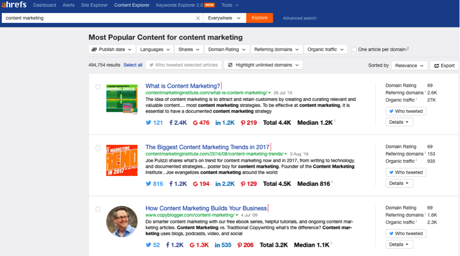 Alternatively you can put in your topic and/or the biggest terms into Ahrefs content explorer to get the best content already out there. Identify the top trends that are being used – are they listicles, ‘how to’ posts, is it data led, are they using click-bait, infographics or long form posts?