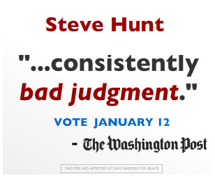 Negative ad messages about Republican opponent Steve Hunt were targeted to likely Republicans and Independents. Display ads included lines from a Washington Post editorial describing Hunt as “remembered mainly for being unanimously censured,” and for having “consistently bad judgment.”