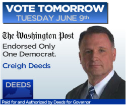 Deeds ran display and search ads targeted to people throughout Virginia for two months leading up to yesterday’s primary. However, the last-minute Google ads were intended for Northern Virginian eyes only. Deeds was endorsed by The Washington Post, and the campaign believed that endorsement would carry more weight with Northerners, said Osterhout.