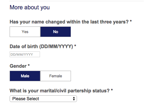 Here, the Halifax mortgage quote form asks for users to enter their date of birth with the day, month and year separated by a dash.