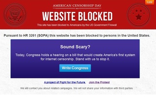 American Censorship, a coalition of Internet freedom groups including Fight for the Future, Creative Commons, and the Electronic Frontier Foundation, is promoting today as “American Censorship Day,” and spreading its anti-SOPA message through a mock Internet censorship barrier blocking site content across the web.