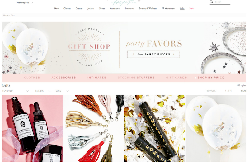 Free People gets right to the point on gifts. They provide a quick visual navigation to guide the customer, but are also showing product immediately. It’s refreshing since so many gift guides require a maze of navigable pages, shopping styles, personality quizzes and other unnecessary journeys.