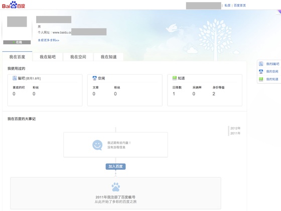 My findings are: Baidu’s definition of social content has included its proprietary content. It is mostly user-generated in nature and being linked and processed primarily through search queries. It won’t be difficult for Baidu to start structuring its proprietary content using users’ profiles, which have existed for a while (see screenshot below).