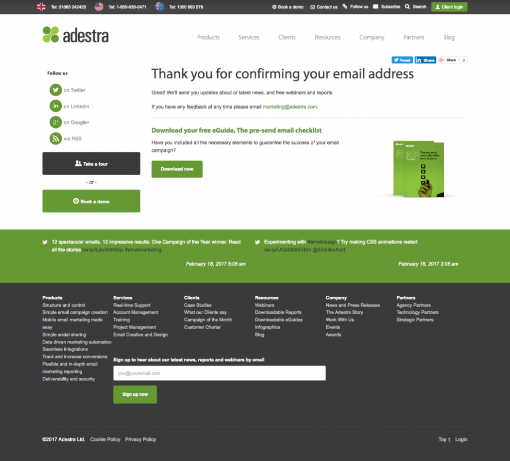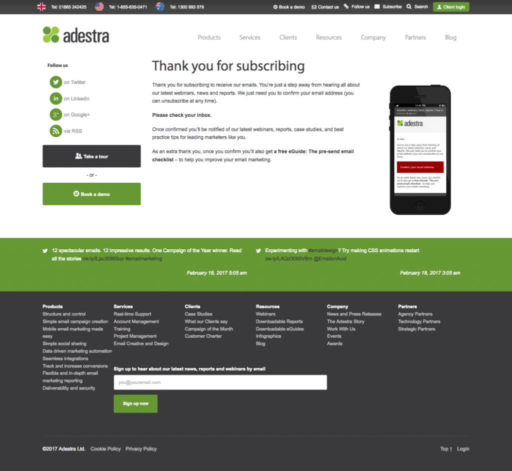 Adestra COI process: Adestra uses a three-part confirmation process. If you sign up for our newsletter, you see this confirmation screen after you enter your email address and click “Sign Up Now:”
