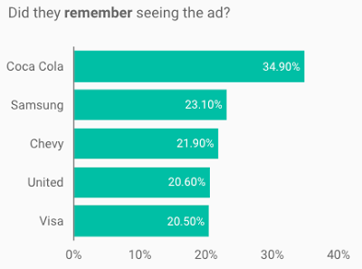The Coca-Cola ad was recalled by almost 35% of respondents, followed by Samsung and Chevy (23% and 22%).