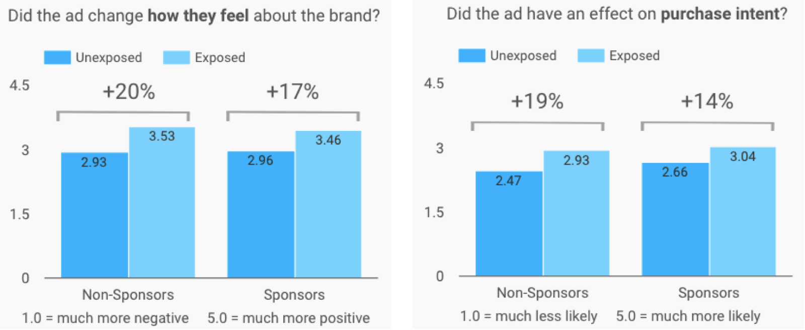 An interesting side-point here is that the impact of ads on respondents’ feelings and purchase intent was exactly the same, whether or not the brands were official Olympics sponsors.