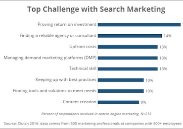Among the respondents who are involved in search marketing, the top challenge was proving ROI from search marketing (cited by 18%).