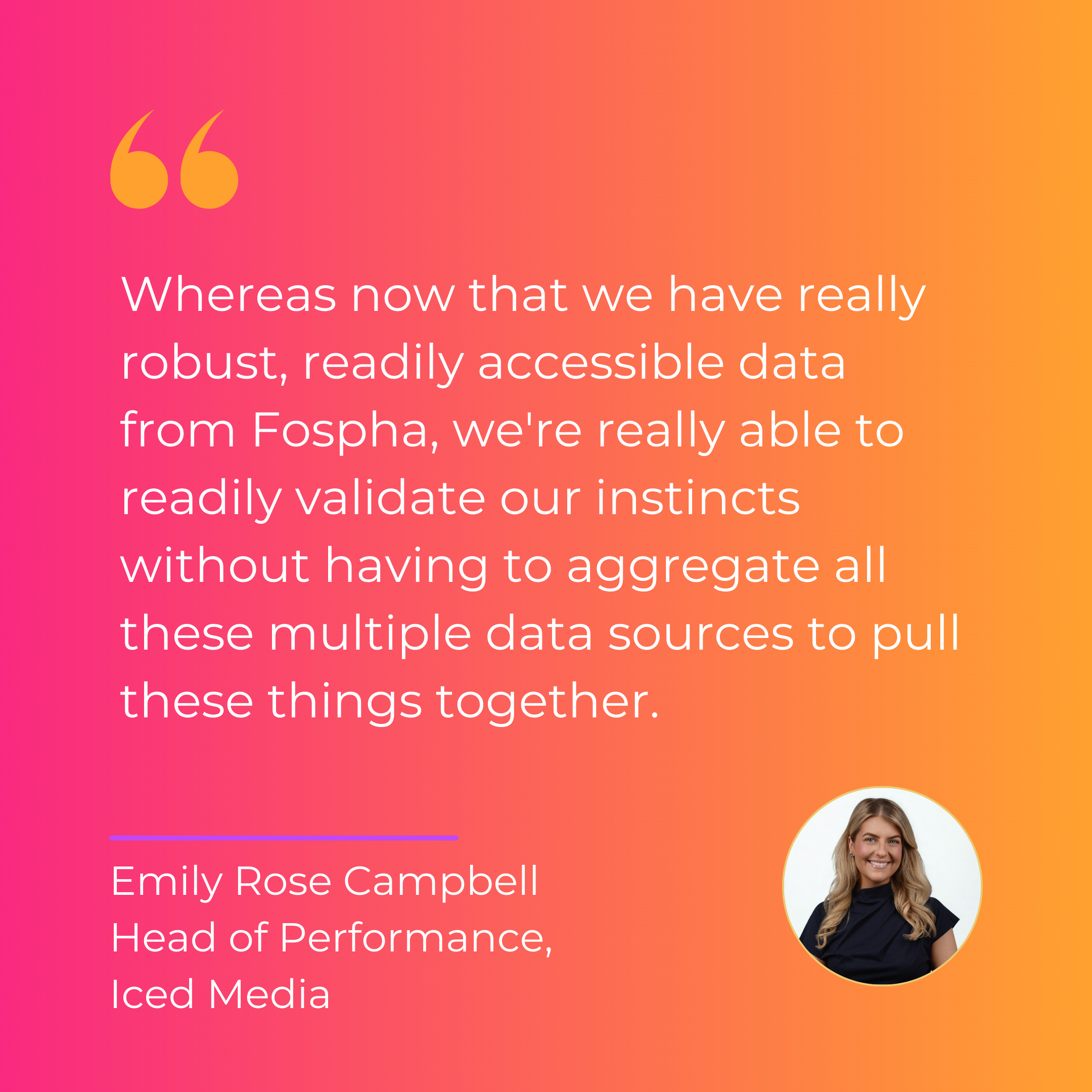 Emily Rose Campbell: It’s been game changing. As growth experts in beauty, we’ve always had strong instincts and deep expertise of the optimal media mix, which tactics drive the greatest halo effect on the overall business and where we see that growth from and that demand creation. Whereas now that we have really robust, readily accessible data from Fospha, we’re really able to readily validate our instincts without having to aggregate all these multiple data sources to pull these things together.