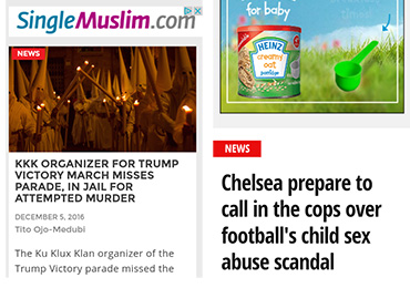 - It is hard to imagine many mainstream advertisers wishing to be associated with a story about a man being arrested for murder, a KKK march in favor of Donald Trump’s victory, or pictured above a picture of a KKK ceremony. There were plenty of examples spotted on various journals – but this was the most controversial: a Muslim dating site alongside this INQUISITR story.