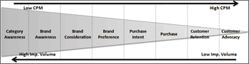 Over the history of advertising, a general consensus has been achieved on what types of media work well for specific goals. The process a person goes through as she makes her way from unknown to paying customer has been carefully studied and codified as the purchase funnel: