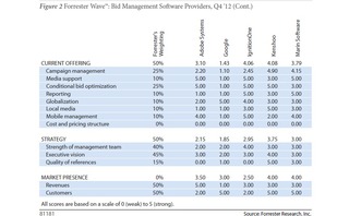 VanBoskirk liked IgnitionOne’s customizable workflow and support for a broad set of biddable media, but noted that clients don’t find the platform easy to use. She ranked Marin highly for media support, reporting, and mobile management, but felt the company’s business strategy wasn’t as strong.