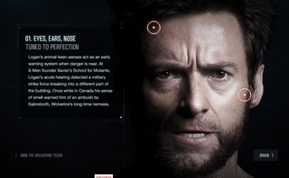 In other words, users can navigate through Jackman/Wolverine’s body parts, including eyes/ears/nose, brain, heart, DNA, muscles, claws and nerves, and click on elements like memories, nightmares and healing to find additional content like YouTube videos and concept art.