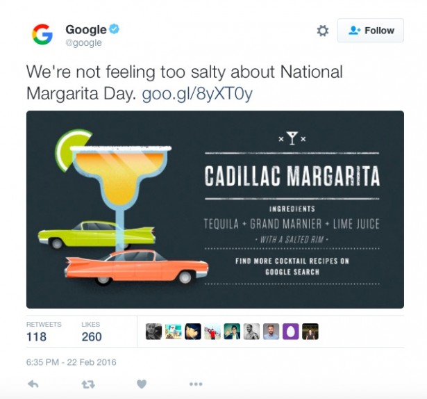 But Google posted too, using the day to promote Google Search, while Time Inc.’s personal finance resource Money shared content on where to buy the drinks for two bucks.